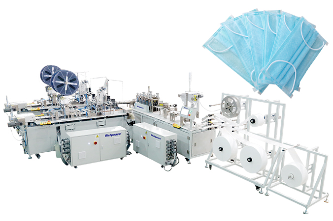 2.生產(chǎn)線采用"一拖二”的結(jié)構(gòu),一臺口罩主體通過傳送系統(tǒng),自動輸送分流到兩套耳帶自動焊接包邊切斷加工工位。