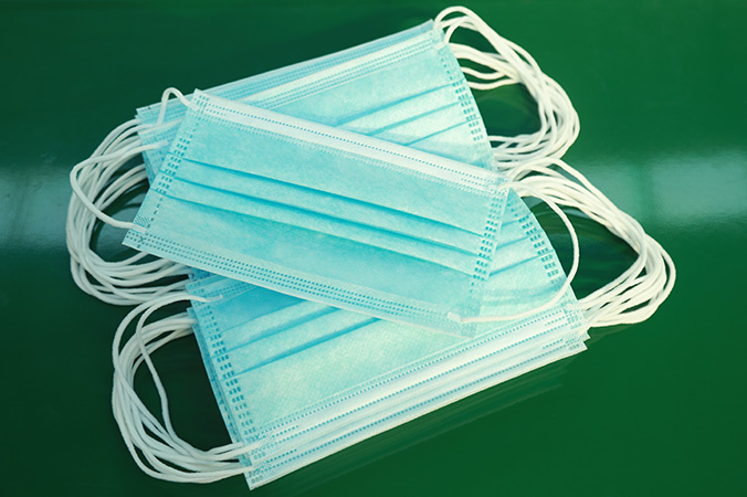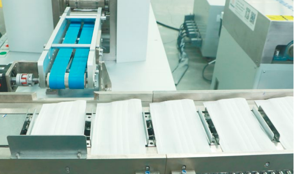 2.面層、濾層、底層三種面料自動對齊入料,雙邊對稱超聲連續壓邊,經連續滾輪壓邊切斷后,分流到兩個工位進行耳帶焊接以提高生產效率,焊完耳帶后自動計數碼堆。