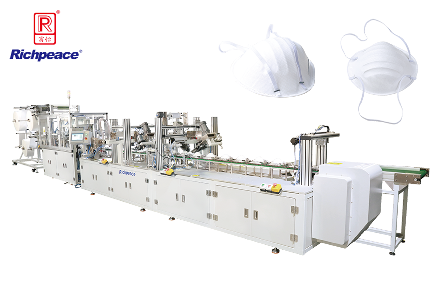富怡全自動(dòng)罩杯口罩生產(chǎn)線,又名罩杯口罩機(jī),一體式設(shè)計(jì) , 從原料進(jìn)入 , 罩杯成型,罩杯周邊焊接,罩杯周邊沖切,自動(dòng)傳輸,貼外置鼻夾 , 自動(dòng)移印 , 自動(dòng)金屬釘頭帶(可選自動(dòng)焊接頭帶), 自動(dòng)超聲波上呼吸閥(選配),機(jī)械手抓取,自動(dòng)傳輸?shù)裙に囎詣?dòng)完成,實(shí)現(xiàn)罩杯式口罩的全自動(dòng)生產(chǎn)。恒溫感應(yīng)自動(dòng)貼外置鼻夾 , 切口圓滑 , 貼合牢固。自動(dòng)移印裝置 , 高效快捷 , 圖案清晰。自動(dòng)雙向金屬釘頭帶裝置,耳帶長(zhǎng)短可調(diào) , 牢固 , 拉力強(qiáng)。成品廢料自動(dòng)分離。