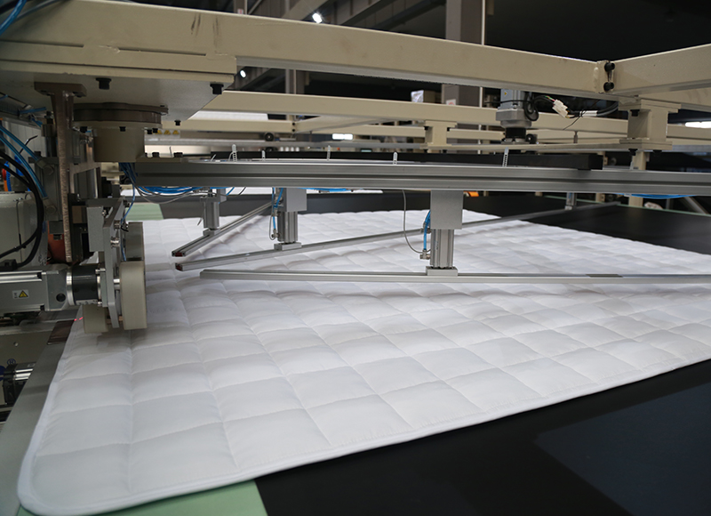 該產線由高速多針紡縫機、鎖四邊機、對正平臺和全自動包邊機組成,主要生產以多針絎縫線跡和包邊工藝為特征的家紡產品,比如被芯、床蓋等;
