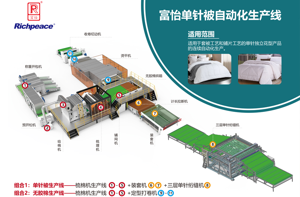 組合1:單針被生產(chǎn)線——梳棉機(jī)生產(chǎn)線+裝套機(jī)+三層單針絎縫機(jī)