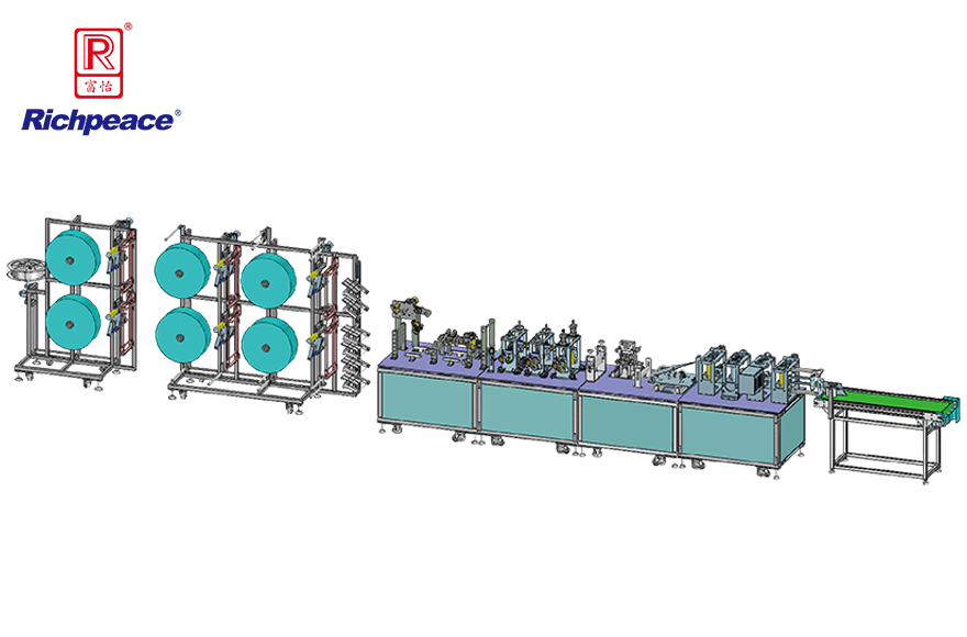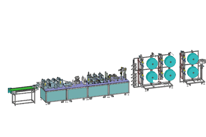 1.口罩一次性焊接成型,面層、濾層、底層3-6卷料自動對齊入料,自動嵌入鼻梁條,花型自動焊接,自動分揀成品和廢料,省人工,高效率。