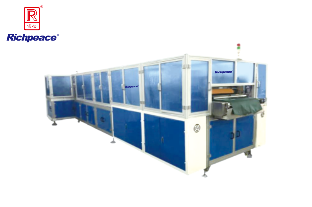 全自動防護服衣身制造機, 從送料到腰帶繩焊接、 領口切割、 折疊、 袖口切割、 肩部焊接、 成型切割均由機器自動完成,無需人工操作。