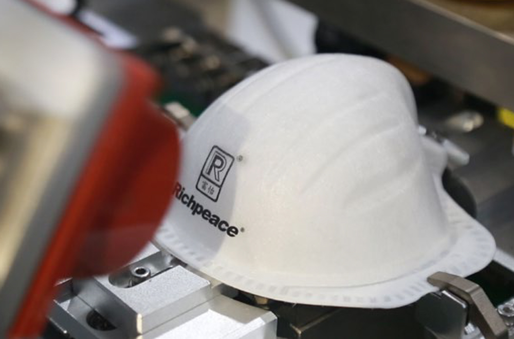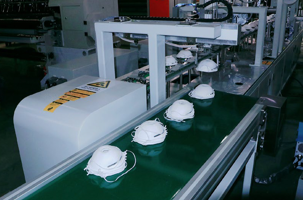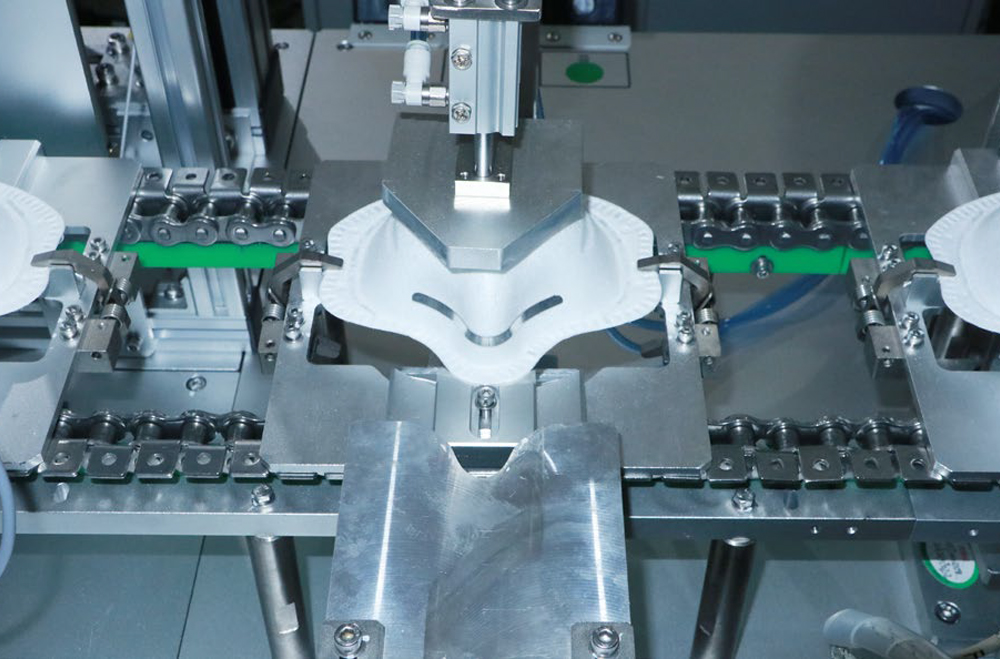 富怡全自動罩杯口罩生產線實現了罩杯口罩從卷料到成品的整個流程。該生產線主要由以下工位組成:料架、杯體內側預成型、杯體成型、轉序、移印、鼻梁條焊接、頭帶焊接、頭帶打釘、呼吸閥打孔超聲波焊接、口罩拾取。每臺機器根據客戶需求選擇進行設計安裝。